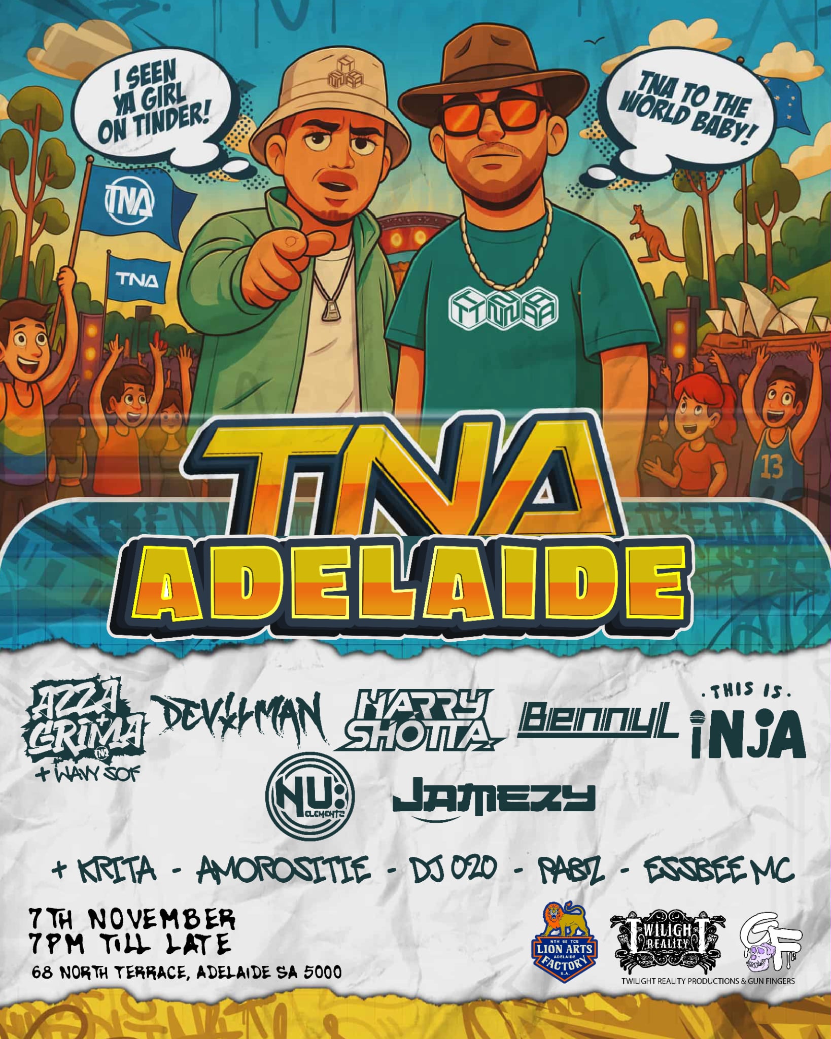Get ready, Adelaide — TNA (Grima x Azza x Nu Elementz) are bringing their explosive UK drum & bass energy to Lion Arts Factory for one unforgettable night.